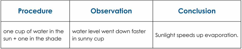 For example, after an investigation comparing how quickly water evaporates in sunlight and in shade, students might fill in a three-column organizer: